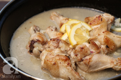 Cũng trong chảo đó, cho tỏi băm vào, đảo cho thơm rồi cho trở lại gà vào, thêm nước cho ngập gà rồi thêm vào 2 muỗng canh nước cốt chanh, tí tiêu, muối, hạt nêm. Hạ lửa nhỏ riu riu cho, nấu cho đến khi nước cạn đi một nửa.