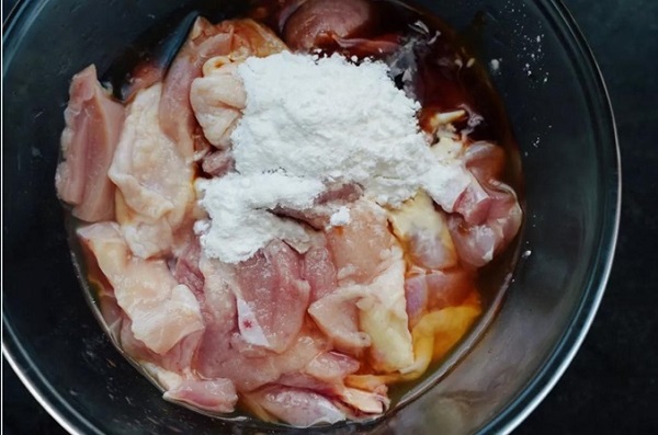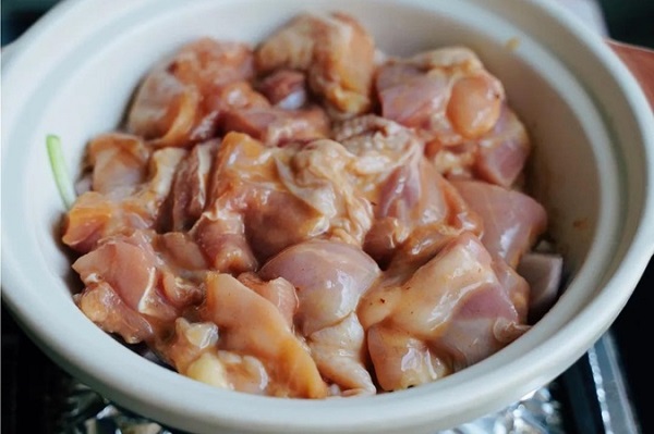 - Bước 1: Đùi gà rửa sạch, chặt miếng vừa ăn. Cho đùi gà vào bát, thêm chút muối, đường, dầu hào, rượu nấu ăn và tinh bột vào trộn đều.