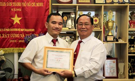 Ông Tạ Long Hỷ trao giấy khen cho lái xe Nguyễn Lê Minh Đức - Ảnh: Công an TP HCM |