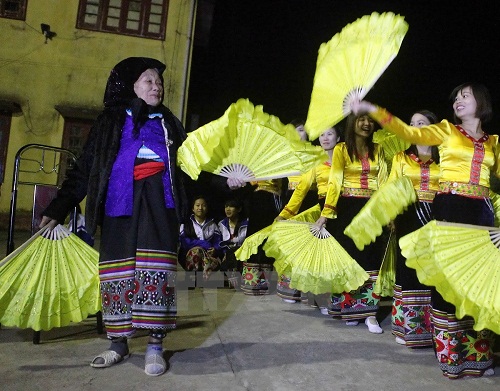 | Nghệ nhân Lang Thị Pen truyền dạy lại những điệu múa cho lớp trẻ. Ảnh: T.T |