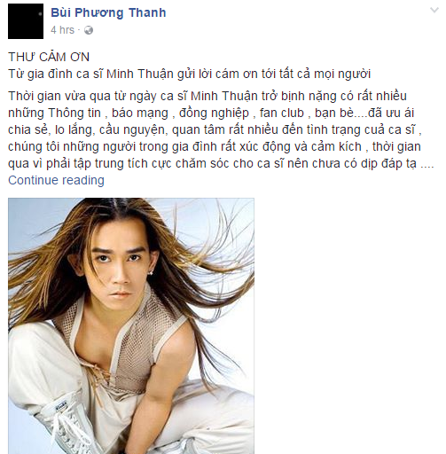 Tất cả những tình cảm quý báu cũng như sự đồng hành của mọi người đã tiếp thêm động lực cho gia đình và an ủi cho Minh Thuận rất nhiều để vượt qua giai đoạn khó khăn này. Một lần nữa xin chân thành cảm ơn! Nhân đây, gia đình cũng quyết định để Phương Thanh là đại diện đưa ra thông tin và quyết định trước công chúng và báo chí".