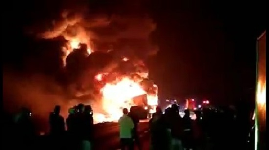 Hiện trường vụ cháy xe đầu kéo chở 32 tấn mủ cao su. Ảnh: VOV |