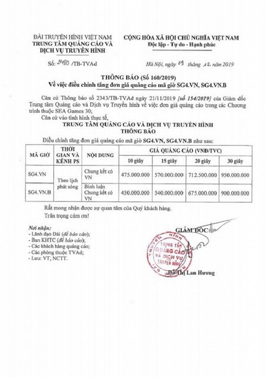 Trước đó, mức giá mà TVAd đưa ra trong trường hợp U22 Việt Nam chơi trận chung kết SEA Games 30 là 250, 300, 375 và 500 triệu đồng tương ứng với thời gian quảng cáo 10, 15, 20, 30 giây.