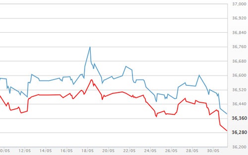 Trước đó, tại thời điểm 9h sáng nay (31/5), giá vàng miếng SJC loại một lượng được Tập Đoàn Vàng bạc đá quý DOJI niêm yết tại Hà Nội niêm yết ở mức 36.30 - 36.38 triệu đồng/lượng (chiều mua vào – bán ra), giảm 110 nghìn đồng/lượng ở cả hai chiều so với ngày hôm qua. Giá vàng SJC tại TP. Hồ Chí Minh niêm yết ở mức 36.300 - 36.38 triệu đồng/lượng (chiều mua vào – bán ra), giảm 120 nghìn đồng/lượng ở cả hai chiều so với ngày hôm qua.