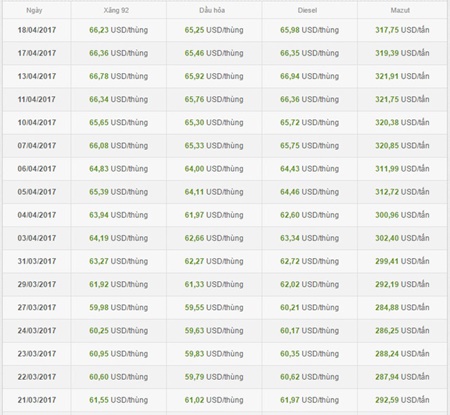 Trước đó, tại kỳ điều chỉnh giá xăng gần nhất vào ngày 21/3, liên bộ Công Thương - Tài chính công bố mức giá xăng RON 92 tối đa là 17.233 đồng/lít. Xăng E5 giảm về mức 17.032 đồng một lít. Giá mỗi lít dầu hoả giảm 189 đồng, bán ra không cao hơn 11.988 đồng, dầu diesel giảm 369 đồng, giá bán không được cao hơn 13.469 đồng/lít và dầu mazut giảm 234 đồng, giá bán tối đa là 10.616 đồng/kg.