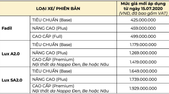 Bảng giá xe VinFast áp dụng từ ngày 15/7/2020. |