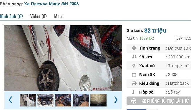 Chiếc Matiz SE 2008 được quảng cáo là xe đẹp, máy chất, chưa đâm đụng, la zăng đúc, tem thể thao, người mua về chỉ việc đổ xăng chạy. 5l/100km. Xe được rao bán giá 82 triệu đồng. |