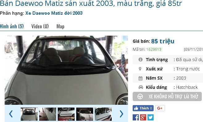 Chiếc Daewoo Matiz đời 2004 màu trắng này được rao giá 80 triệu đồng trên thị trường ô tô cũ. Xe được quảng cáo là không hao xăng, chạy tốt và vận hành an toàn. |