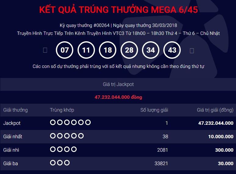 Tại kỳ Quay số mở thưởng thứ 264 sản phẩm Mega 6/45 mở thưởng ngày 30/3, Công ty Xổ số điện toán Việt Nam (Vietlott) xác định có 1 vé trúng thưởng Jackpot trị giá hơn 47 tỷ đồng.