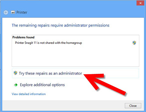 Tiếp tục thao tác với nút lệnh Try these repair as an administrator |