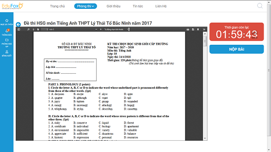 Thử trải nghiệm trên một trong những mô hình ôn thi trực tuyến hiện nay như Edufox.vn, có thể thấy tổng hợp đề thi của tất cả các cấp học từ tiểu học đến THCS, THPT, thi học sinh giỏi, thi lớp 9 lên lớp 10, thi THPT Quốc gia, thi học kì… Học sinh chỉ cần truy cập đường link https://edufox.vn, tạo tài khoản, đăng nhập và thi thử một cách dễ dàng. Với giao diện dễ sử dụng và thông minh, Edufox.vn mang đến cho học sinh cảm giác như thi thật với đồng hồ bấm thời gian, trả lời trắc nghiệm, tính điểm… Học sinh có thể tham gia cả hình thức thi trắc nghiệm và thi tự luận của các môn: Toán, Lý, Hóa, Văn, Anh, Sinh, Sử, Địa, Tiếng Việt. Sau khi thi xong, nộp bài học sinh sẽ nhận được kết quả đánh giá và đáp án cho bài thi của mình.