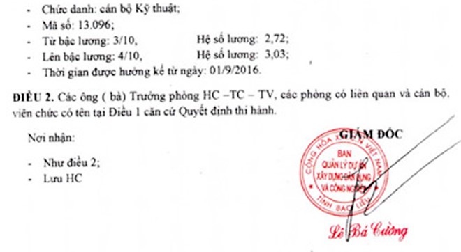 Ông Lê Bá Cường không còn làm Giám đốc Ban Quản lý dự án Xây dựng dân dụng và công nghiệp tỉnh Bạc Liêu nhưng vẫn ký quyết định nâng lương cho một phó giám đốc.