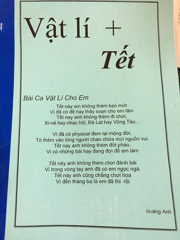 Vừa qua một thầy giáo Vật Lý cũng đã gây sốt cộng đồng mạng bởi cách cổ vũ tinh thần học sinh cực lầy lội. Theo đó, khi giao cho học trò một tệp bài tập, thầy đã chế lại lời bài hát "Bài ca tết cho em" của ca sỹ Quang Lê thành bài hát có tên "Bài ca Vật Lý cho em" và in trịnh trọng ngay bìa tập tài liệu.
