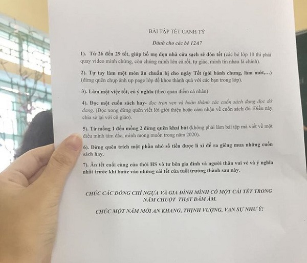 Cụ thể, khi cả lớp chuẩn bị ra về, giáo viên đã thông báo về việc giao bài tập Tết với vẻ mặt nghiêm nghị. Cả lớp im lặng, học sinh ai nấy đều không vui. Tuy nhiên, khi đọc các bài tập về nhà trong tờ A4 mà giáo viên đưa, học sinh đã reo hò, sung sướng.