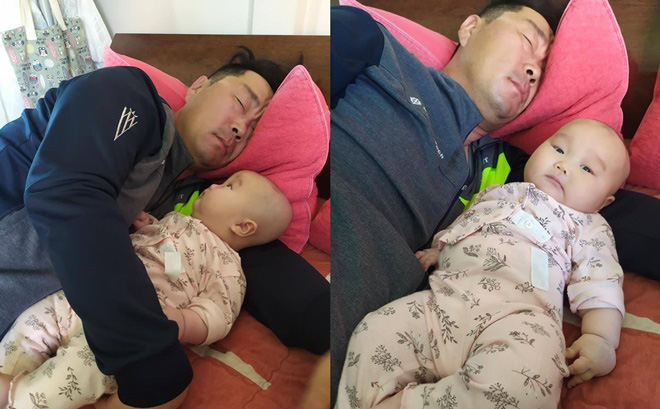 "Mẹ bảo bố trông con nhưng thành ra con ru bố ngủ luôn". |