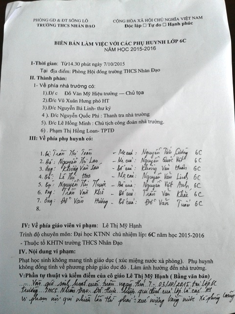 Biên bản làm việc với các phụ huynh liên quan tới sự việc |
