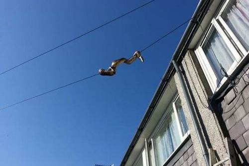 Hình ảnh ghi lại cho thấy con trăn này đang cố đu mình và treo lủng lẳng trên dây điện đi đến đầu phía bên kia và trườn xuống một ống thoát nước giữa hai cửa sổ của tòa nhà, thông tin từ Wales Online.