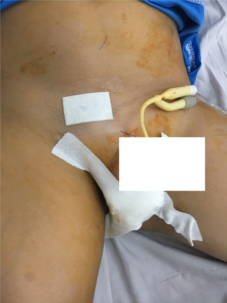 Bé được gia đình được đưa vào Bệnh viện Củ Chi để sơ cứu và được chuyển đến Khoa Cấp cứu Bệnh viện Nhi Đồng 1 vào lúc 14h30 phút cùng ngày. Bé được nhập lên khoa Ngoại Tổng Hợp với chẩn đoán: vết thương vùng bìu xuyên thấu bụng.