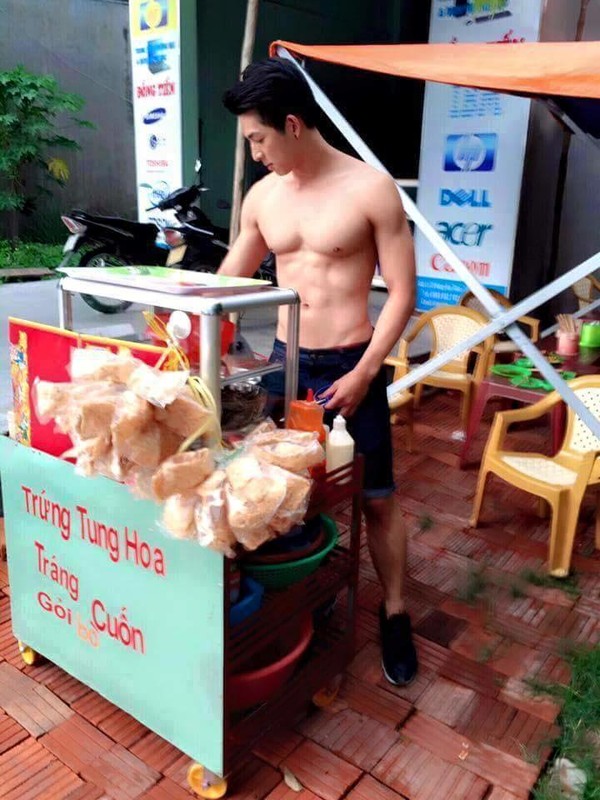 Cận cảnh bức ảnh anh chàng 6 múi đứng bên quầy bánh tráng. |