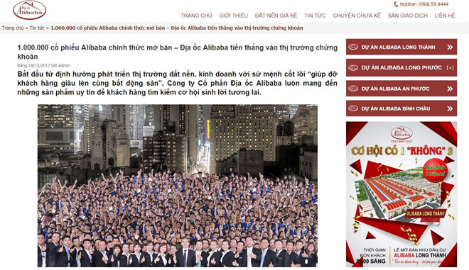 Theo nội dung bài viết đăng tải trên website diaocalibaba.vn, công ty này nêu rõ: "Địa ốc Alibaba bên cạnh việc dẫn đầu thị trường đất nền vùng ven đã vững, doanh nghiệp tiếp tục mở rộng, tạo nên bước ngoặt mới trong thị trường chứng khoán - kênh đầu tư mang lợi nhuận "thả ga" tại Địa ốc Alibaba. Hơn 1 triệu cổ phiếu Alibaba được chính thức mở bán với mệnh giá 10.800 VNĐ/cổ phiếu vào 24/12 tới đây sẽ giúp khách hàng có thêm lựa chọn, đón đầu xu hướng đầu tư song song bất động sản và chứng khoán trước sự phát triển mạnh mẽ, sôi nổi của thị trường".