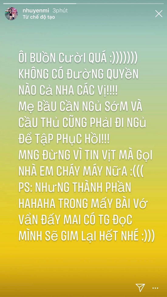 "Ôi buồn cười quá. Không có đường quyền nào nha các vị. Mẹ bầu cần ngủ sớm mà cầu thủ cũng phải đi ngủ để tập phục hồi! Mọi người đừng vì tin vịt mà gọi nhà em cháy máy nữa.