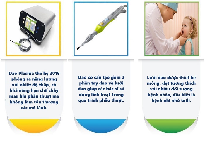 - Tính an toàn vượt trội: Dao Plasma thế hệ 2018 có thiết kế mỏng, dẹt, vì vậy an toàn kể cả khi phẫu thuật cho những bệnh nhi có vòm họng nhỏ, hẹp. Lượng thuốc tê được sử dụng khi phẫu thuật bằng dao Plasma thấp hơn rất nhiều so với những phương pháp cũ, giúp hạn chế các biến chứng sau mổ.