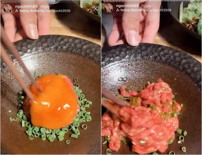 | Ngọc Trinh rất thích món gỏi thịt bò sống, liên tục đăng story về món ăn này. |