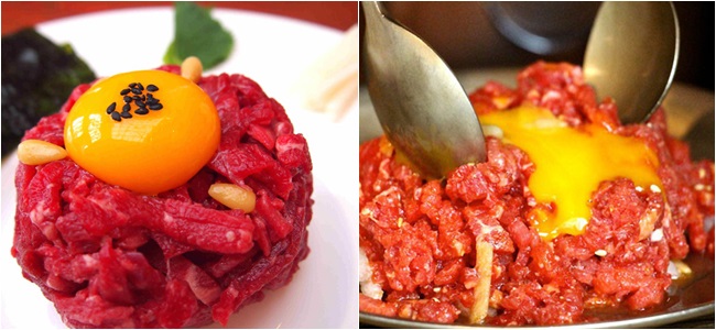 Gỏi thịt bò sống gọi là Yukhoe trong tiếng Hàn, được lấy cảm hứng từ món Tartare của người Pháp (cũng là một món thịt sống. Miếng thịt được chọn kỹ rồi thái mỏng hoặc băm nhỏ, sau đó ướp với 8 loại gia vị để át đi mùi tanh, khi ăn sẽ được trộn cùng lòng đỏ trứng gà để thêm ngậy.