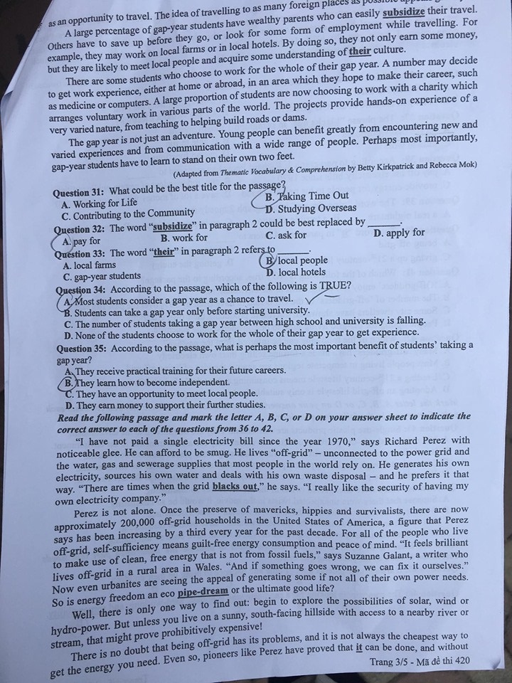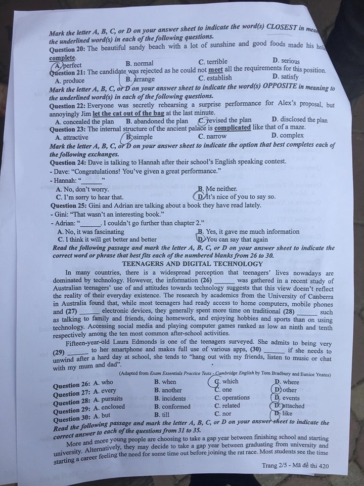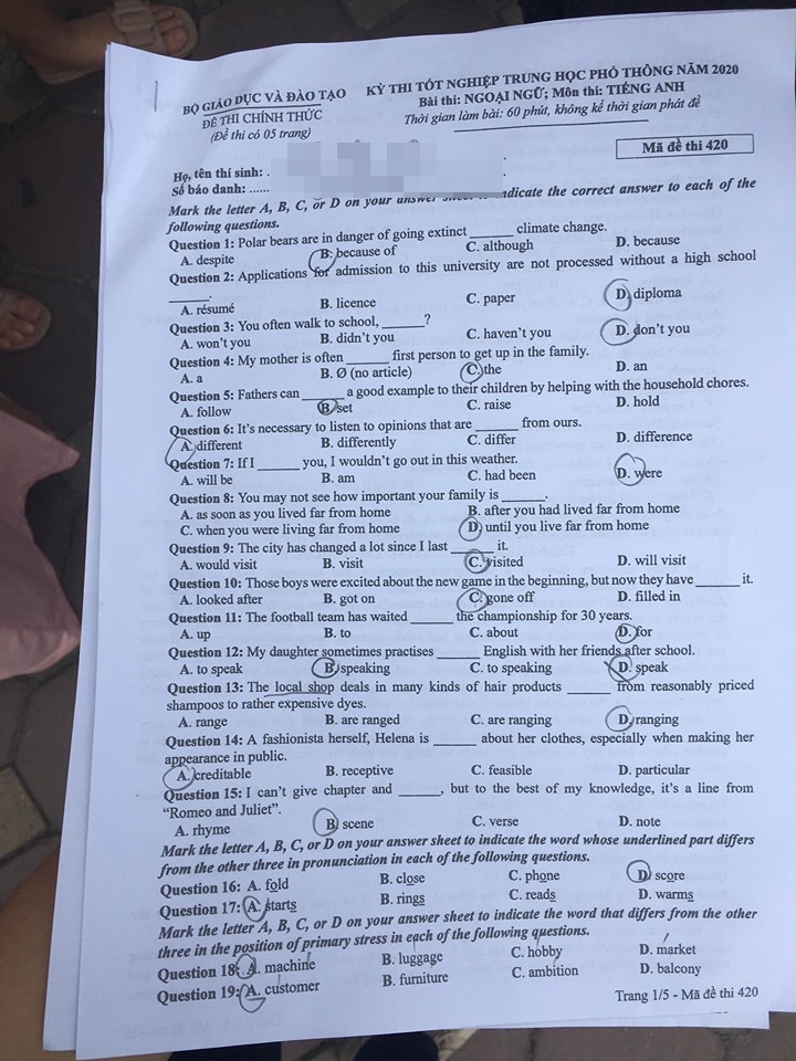 Đề thi môn tiếng Anh mã đề 420 tốt nghiệp THPT 2020. |