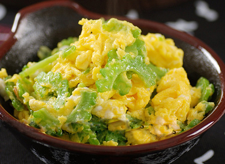 Nguyên liệu; 300gr mướp đắng (chọn quả nở gai), 2 trứng vịt, 2 tép hành lá. Gia vị: Tiêu, bột ngọt, tỏi, dầu ăn, nước mắm.
