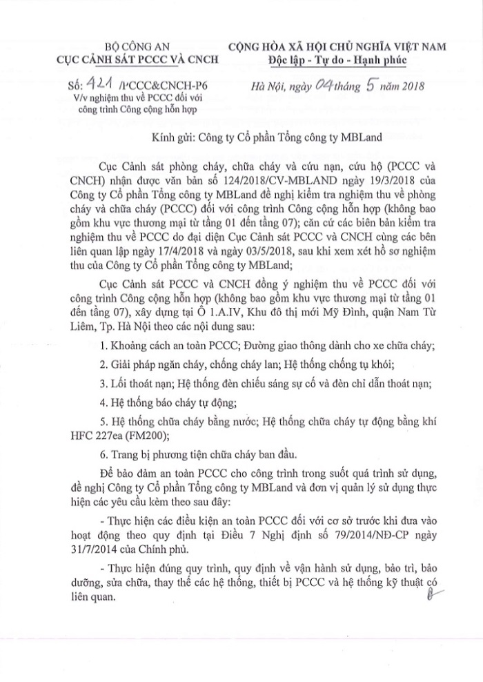 | Công văn nghiệm thu PCCC từ Cục Cảnh sát PCCC&CNCH, Bộ Công an. |