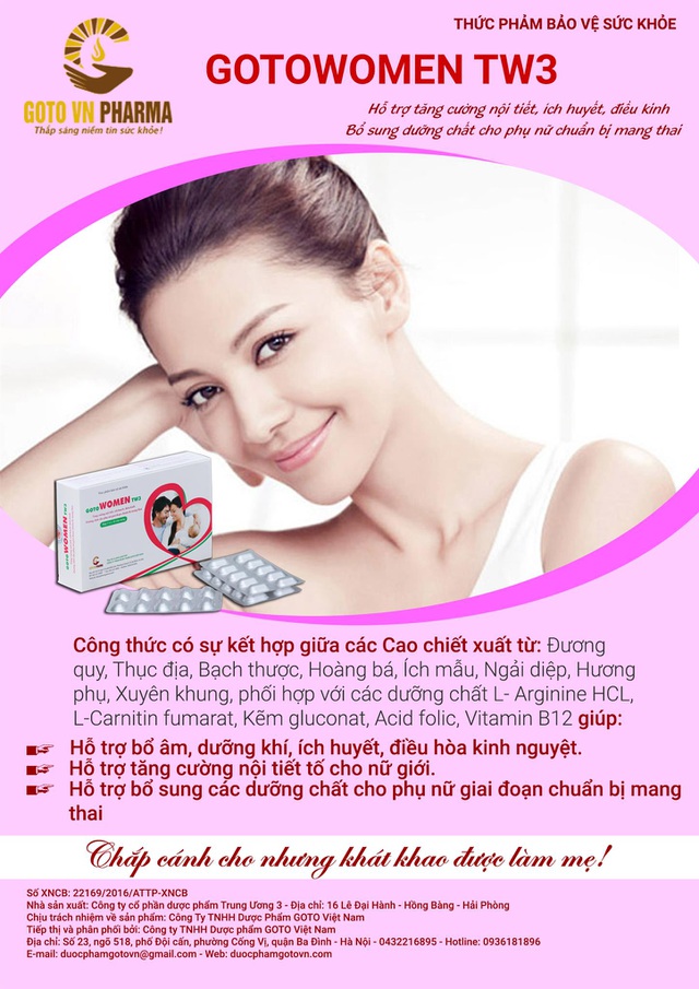Gotowomen TW3 là sản phẩm "Chắp cánh cho những khát khao được làm mẹ!" với công thức có sự kết hợp giữa các Cao chiết xuất từ: từ Đương quy, Thục địa, Bạch thược, Hoàng Bá, Ích mẫu, Ngải diệp, Hương phụ, Xuyên khung, L-Arginine HCL, L-Carnitin fumarat, Kẽm gluconat, Acid folic, Vitamin B12 giúp: