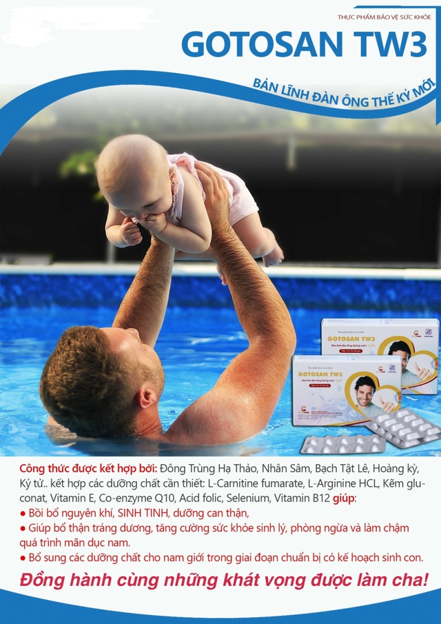Gotosan TW3 là sản phẩm "Đồng hành cùng những khát vọng được làm cha!" với công thức được kết hợp bởi: Đông Trùng Hạ Thảo, Nhân Sâm, Bạch Tật Lê, Hoàng Kỳ, Kỷ Tử...kết hợp các dưỡng chất cần thiết: L-Carnitine fumarate, L-Arginine HCL, Kẽm Gluconat, Vitamin E, Co-enzyme Q10, Acid folic, Selenium, Vitamin B12 giúp: