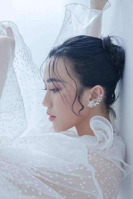Kết hợp lối trang điểm nhẹ nhàng cùng phụ kiện như hoa tai càng nhấn nhá cho biểu cảm “lả lơi” của diễn viên 9X. |