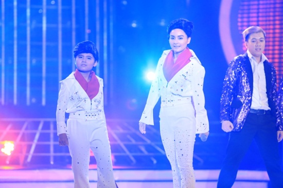 21h53: Minh Khang có những cú nheo mắt và những cú đá chân vô cùng điệu nghệ theo đúng phong cách của ông vua nhạc Rock khi cùng với diễn viên Lan Phương hóa thân thành Elvis Presley với bài hát "Blue Suede shoes".