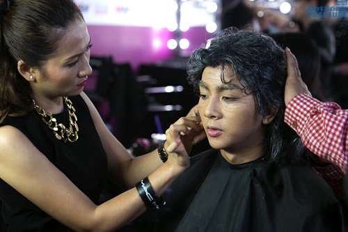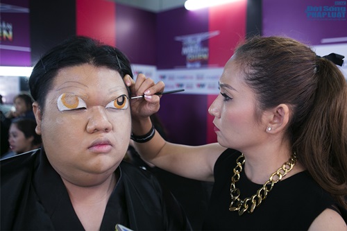 Vương Khang đã phải nhờ tổ hóa trang giúp anh vẽ một đôi mắt thật to theo đúng tính chất hoạt hình. |