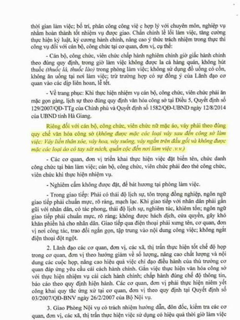 UBND huyện Quang Bình (tỉnh Hà Giang) vừa ra văn bản cấm cán bộ, công chức nữ được mặc váy ngắn đến cơ quan công sở; cấm hút thuốc lào, đặt bát hương trong phòng làm việc.