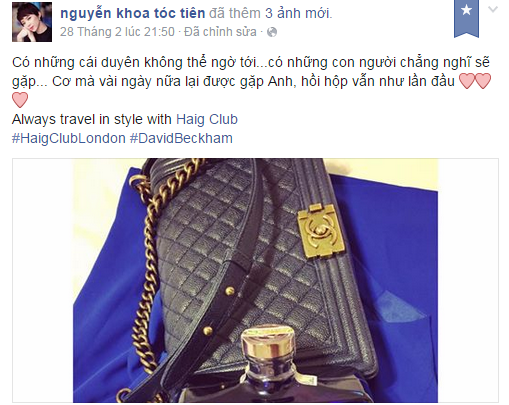 Cùng với đó, ca sĩ Tóc Tiên cũng vừa bày tỏ cảm xúc khi vài ngày nữa được gặp David Beckham ở London. Nữ ca sĩ cho biết, đó là một cái duyên không ngờ tới và cô vẫn hồi hộp như lần đầu nghe tin được gặp anh. Tóc Tiên viết: "Có những cái duyên không thể ngờ tới... Có những con người chẳng nghĩ sẽ gặp... Cơ mà vài ngày nữa lại được gặp anh, hồi hộp vẫn như lần đầu".