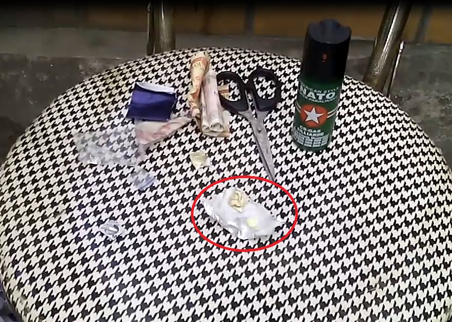 Qua kiểm tra, tại chốt 141, tổ công tác đã phát hiện ra trong túi quần của một nam thanh niên ngồi ghế sau bên phải có một bình xịt hơi cay, một gói nhỏ heroin (đối tượng đã thừa nhận) và 1 viên thuốc màu vàng.