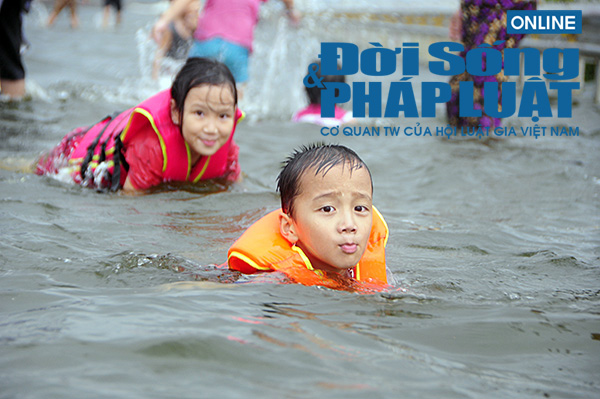 Nhiều người dân tranh thủ cho các em nhỏ ra đây bơi lội ngay trên mặt đường. |