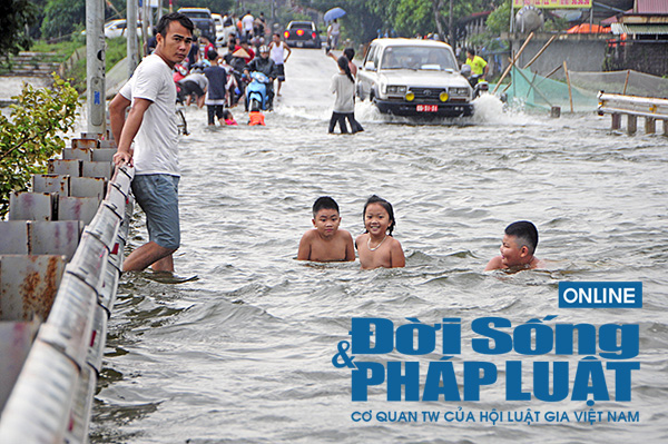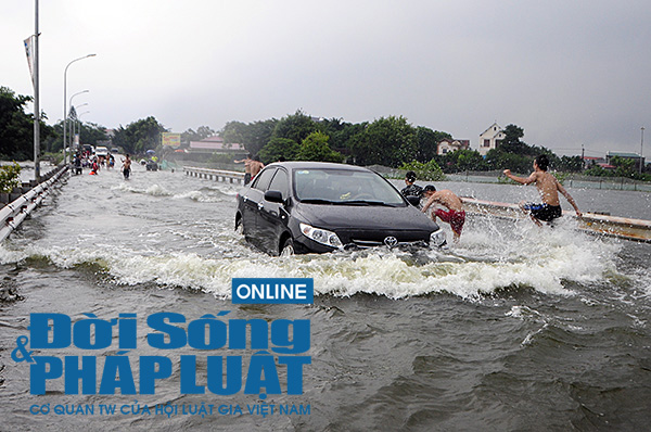 Chiều 29/7, theo ghi nhận của PV báo Đời sống & Pháp luật, rất đông người dân thôn Cấn Thượng, xã Cấn Hữu, Quốc Oai (Hà Nội) đưa các em nhỏ ra bơi lội trên mặt đường tỉnh lộ 421B, bất chấp nguy hiểm do nhiều ô tô vẫn qua lại.