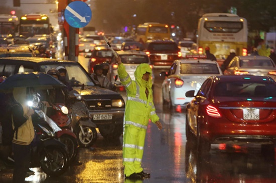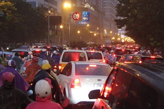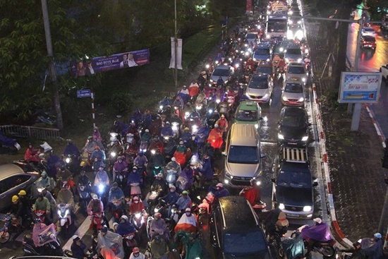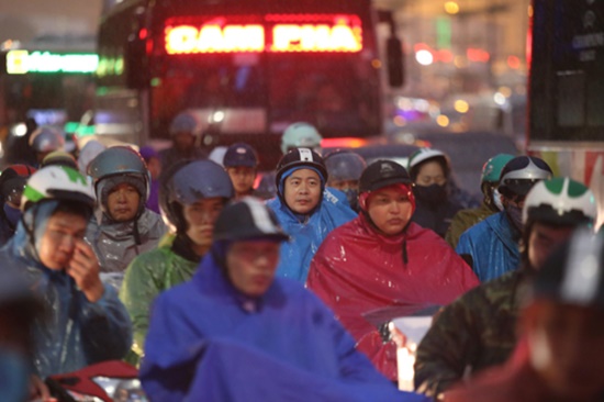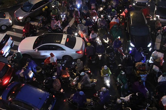 | Các phương tiện kẹt cứng vì mật độ lưu thông quá dày đặc trong cơn mưa. Ảnh: VietNamNet |