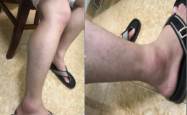 Chân anh P. rất may chỉ bị tổn thương phần mềm sau cú bị xe xô tiếp theo |