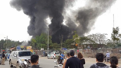 Khu quán ăn, xưởng sản xuất ở làng Triều Khúc, Thanh Trì ( Hà Nội) bất ngờ bốc cháy ngùn ngụt, khói đen bốc lên cao hàng chục mét.