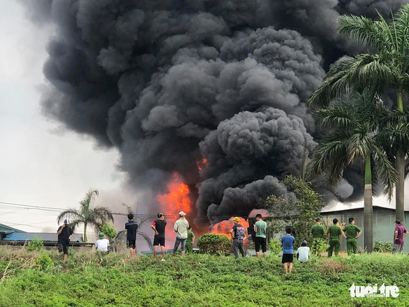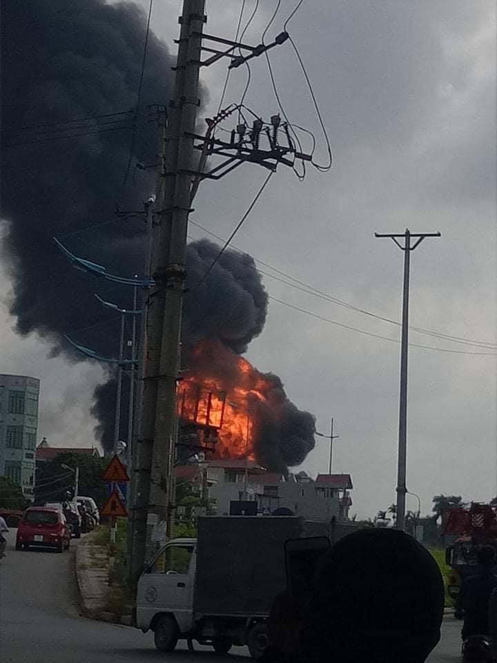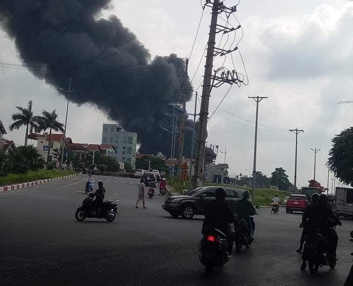 Nhiều tiếng nổ phát ra từ bên trong kho xưởng, cột khói đen bốc cao hàng chục mét khiến người dân ở xa cũng trông thấy.