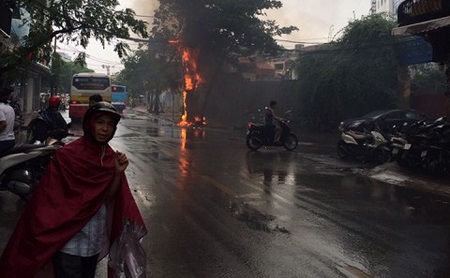 Giữa cơn mưa nặng hạt, chiếc cột điện tại khu vực ngã ba Vọng - Giải Phóng, Hà Nội bất ngờ bốc cháy dữ dội, khiến người dân hoảng hốt.