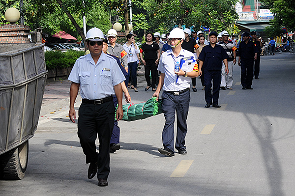 | Ghi nhận của PV, từ 7h sáng 28/6, các lực lượng chức năng quận Ba Đình, phường Cống Vị và các đơn vị liên quan đã có mặt tại khu vực phố Phan Kế Bính. |