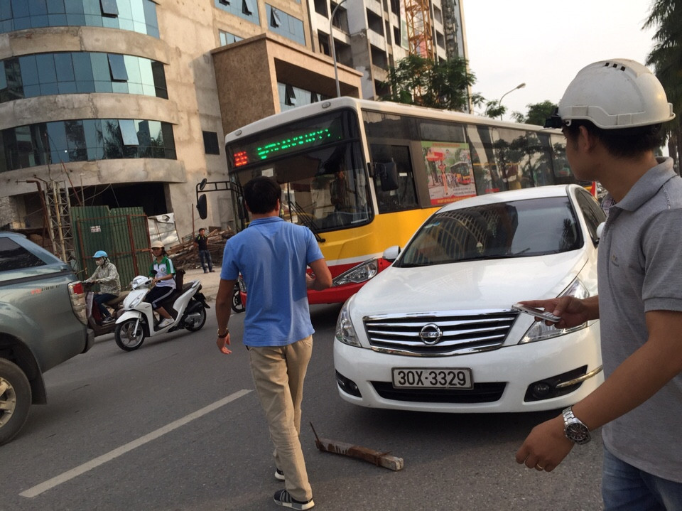 Một số người dân có mặt tại hiện trường cho biết, vào thời điểm trên, khi chiếc xe ô tô màu trắng nhãn hiệu Nissan mang BKS 30X 3329 do một người phụ nữ điều khiển lưu thông trên đường Lê Đức Thọ khi đi đến trước cửa công trình số nhà 21 thuộc Công ty Thăng Long thì bất ngờ bị một thanh sắt dài khoảng 50cm rơi trúng nóc.