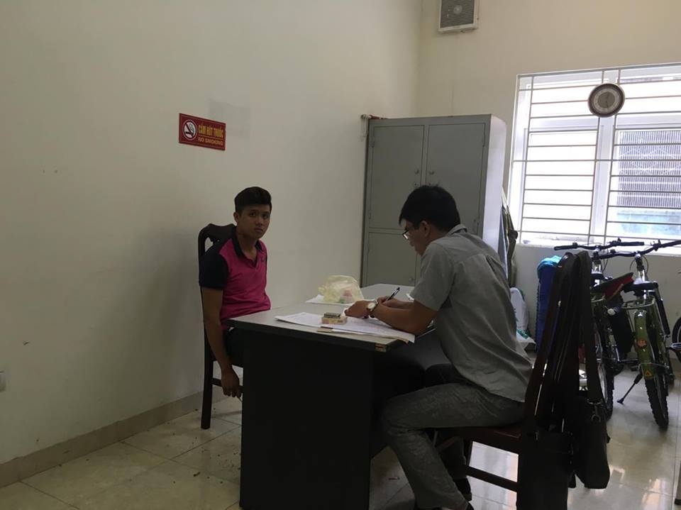 Đối tượng Tùng (áo đỏ) tại cơ quan điều tra. |