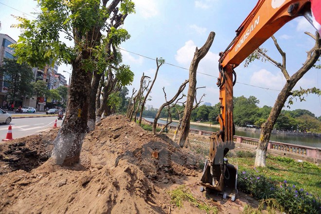 Sau khi tỉa cành cách đây 5 ngày, những cây xà cừ trên đường Kim Mã bắt đầu được công nhân đánh gốc sẵn sàng di dời. (Ảnh: Minh Sơn/Vietnam+) |